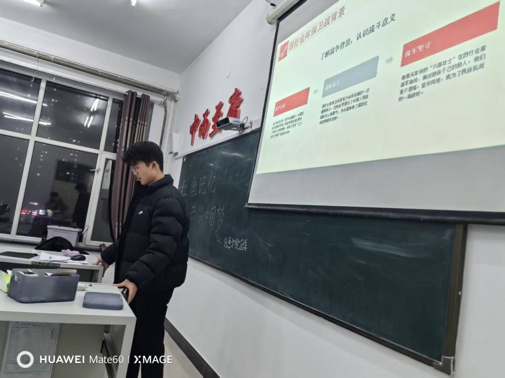 活动开始,费迪同学通过一段红色纪录片回顾了革命先辈的奋斗历程,随后带领同学们分享红色故事:有的同学讲述了《红岩》中江姐的坚贞不屈,有的同学分享了长征路上“半条被子”的温暖情谊,现场氛围庄重而热烈,同学们的眼神里满是敬意与动容。在“红色记忆共创”环节,各小组围绕“新时代青年如何续写红色篇章”展开讨论 活动播放一段《觉醒年代》经典片段,镜头里革命先辈的呐喊瞬间让现场安静下来。随后的“红色故事接力”环节,同学们轮番讲述:有人重现李大钊“铁肩担道义”的慷慨陈词,有人细说“两弹一星”元勋隐姓埋名的奉献。最后,当讲到脱贫攻坚中“90后”干部的青春答卷时,不少同学红了眼眶。将活动氛围推向高潮。