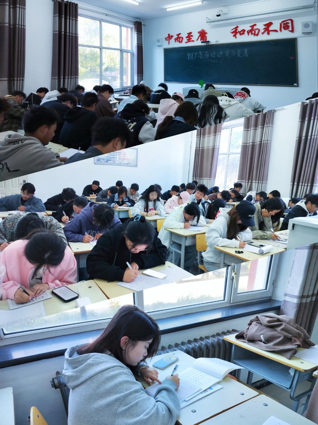 竞赛现场气氛既紧张又充满文化韵味。参赛者们端正坐姿,凝神静气,专注于笔尖的一起一落。钢笔、中性笔在素笺上舞动,或勾勒出清秀工整的楷书,或挥洒出行云流水般的行书。每一幅作品不仅体现了同学们对汉字笔画、结构、章法的理解与把握,更展现了他们对于规范书写和语言文明的重视。