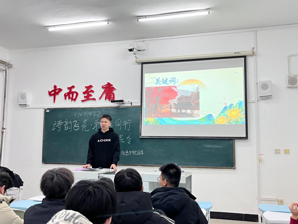 活动伊始,杜林杰同学详细介绍了飞花令的规则与流程,随后一场紧张激烈的诗词对决拉开帷幕。随后,杜林杰同学围绕“春”“花”“月”“水”等常见意象展开问答,从“春风又绿江南岸”到“桃花潭水深千尺”,从“明月松间照”到“清泉石上流”,一句句经典诗词脱口而出。其次,杜林杰同学以诗句为核心,进行看图猜诗句环节。每位同学凭借对诗句的熟悉程度,现场氛围到达了高潮,活动过程中安排了专人记分,确保活动公平公正。最后,按照得分的排名,颁发了一等奖、二等奖、三等奖。杜林杰同学表示希望通过这次活动让同学们感受到了传统文化的魅力。