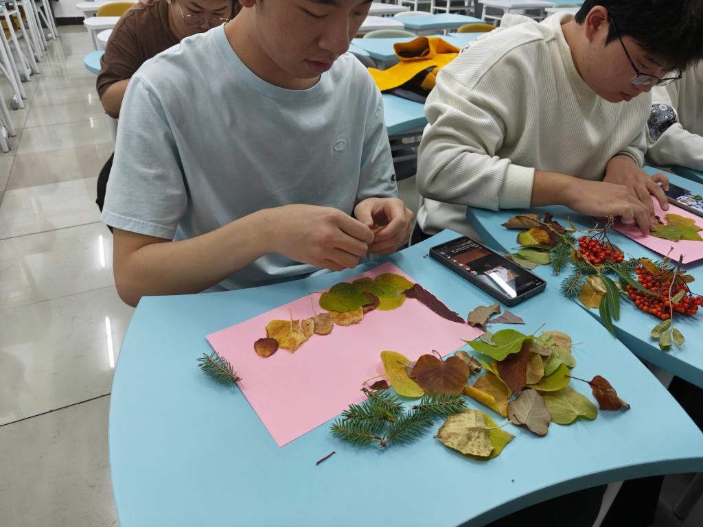 活动前期,通过精心筹备,提前收集校园内银杏叶、枫叶、梧桐叶等多种落叶,分类整理后整齐摆放在活动现场,并准备了胶水、剪刀、彩纸、相框等丰富创作材料。活动开始后,主持人简单介绍创作思路与安全注意事项,同学们便迫不及待地投入创作,同学们围坐在一起,或独自构思,或三五成群交流想法,挑选心仪的落叶搭配色彩与材质。有的同学将不同形状的落叶拼接成灵动的飞鸟、可爱的小动物;有的用落叶勾勒出校园风景,将教学楼、林荫道等元素融入作品,创意十足。活动尾声,同学们纷纷展示自己的作品,相互欣赏、拍照留念,脸上洋溢着满满的成就感。