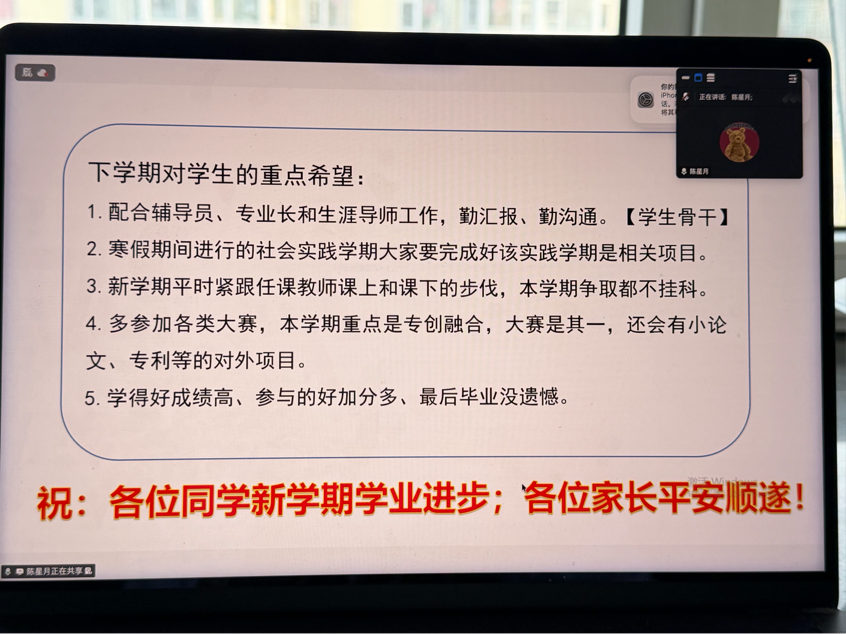 班会伊始,陈星月老师结合近期班级学业情况,对课程学习、作业完成、课堂出勤等方面进行总结分析,重点针对挂科危害、补考重修流程、学业预警机制等内容进行详细讲解,提醒同学们认清学业松懈带来的影响,合理规划学习时间,及时查漏补缺,主动向老师和同学请教,切实提升学习效率。其次,在考风考纪教育环节,陈星月老师带领大家认真学习学校考试管理规定与违纪处分条例,结合典型案例强调考试作弊的严重后果,要求全体同学树立诚信考试意识,自觉遵守考场纪律,做到诚信应考、拒绝舞弊。最后,陈星月老师鼓励大家以端正的态度、扎实的知识迎接各项考核,用真实成绩证明自己。