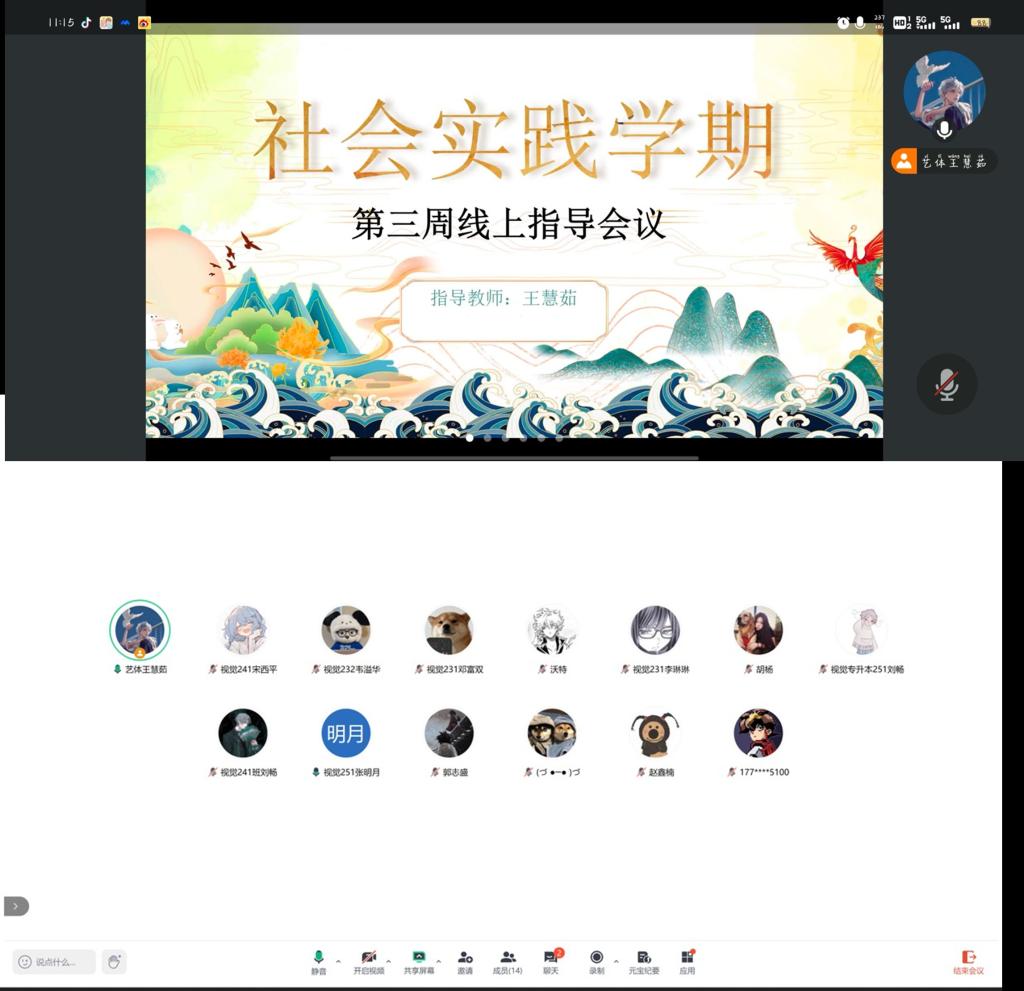 1月23日,艺术与体育学院指导数师王慧茹组织召开社会实践学期第三周指导推进会,会议围绕前期实践活动开展博况进行全面复盘总结,统筹部署后续相关工作,为全面梳理社会实践第三周的开展情况。全体小组成员悉数参会。