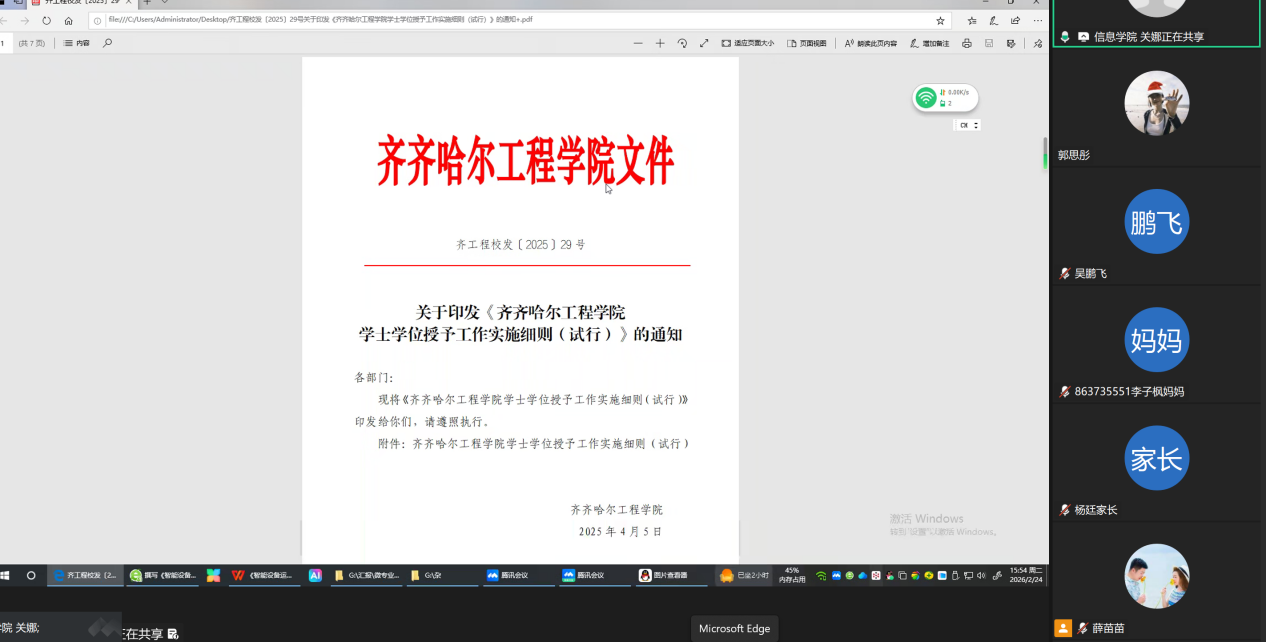 2月24日下午,辅导员老师通过线上形式,分别为计科25级、电科23级、专升本25级依次召开云家长会、云班会,三个班级全体学生及计科25级、专升本25级学生家长参与会议,会议由辅导员薛苗苗主持,共计300余人参加。