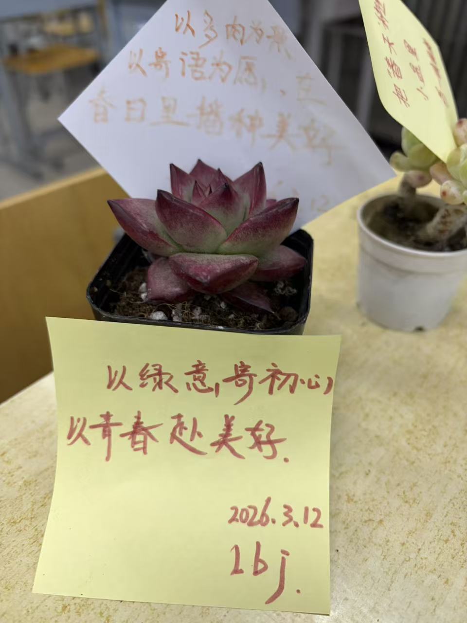 首先,任雪明确本次活动目标,是以植树节为契机,以“‘植’笔绘春色,运动添新林”为核心主题,旨在让师生们通过亲手制作多肉盆栽,感受绿植生机,传递绿色环保理念,同时丰富课余生活,增进同学间的交流互动。随后,张欣宇为每位参与同学分发了多肉幼苗、花盆、土壤、便利签等材料。在轻松的氛围中,同学们纷纷动手实践,小心翼翼地清理多肉根系摆放植株,充分发挥创意,搭配出独特的微景观造型。最后,同学们相互交流技巧、分享想法,同学们还在盆栽上贴上写有自己名字和对未来、对自然寄语的便利签,为作品增添了专属意义。