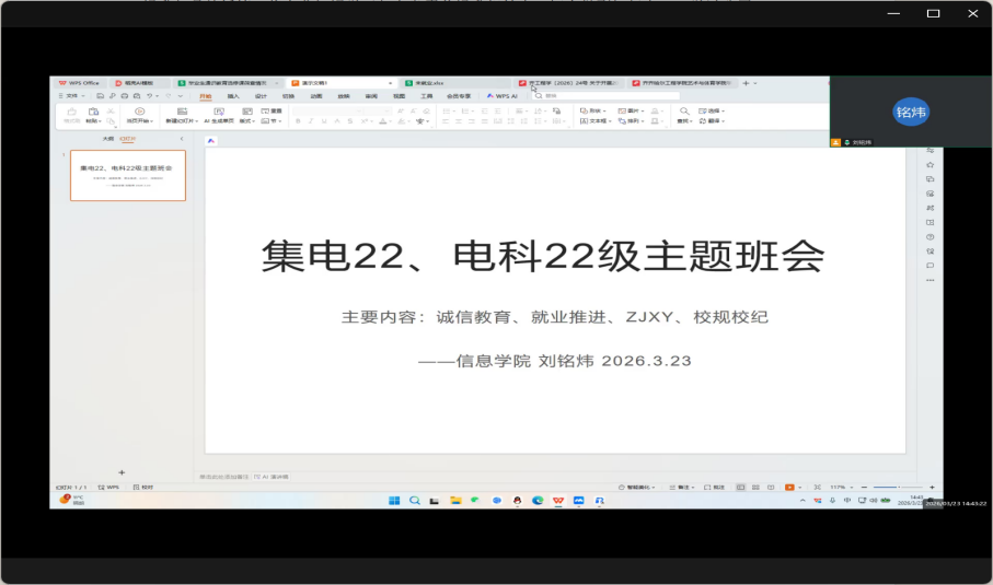 为深入落实立德树人根本任务,引导集电22级、电科22级学子坚定理想信念、规范自身言行、锤炼过硬本领,3月23日下午,bevictor伟德国际1946辅导员刘铭炜组织召开线上集电22级、电科22级班会,所负责的三个班级全员参会。