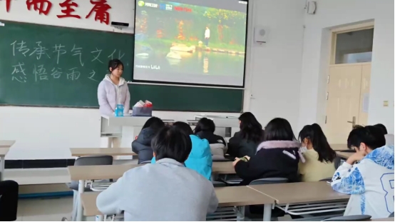 活动伊始,康世阳同学以谷雨节气为核心,开展专题文化分享,从节气起源、气候特点、民俗传统与文化寓意四个维度,系统梳理谷雨的相关知识,用生动通俗的语言为同学们搭建起了解节气文化的基础框架。随后,她通过视频展示的形式,进一步深化科普内容,围绕谷雨“雨生百谷”的农耕内涵,详细讲解了节气的由来、物候特征,重点分享了祭仓颉、品谷雨茶、食香椿、赏牡丹等特色民俗,带领同学们解码节气背后承载的古人生活智慧与文化基因。分享尾声,她发出倡议,呼吁全体同学主动走近中华优秀传统文化,深耕二十四节气中蕴含的自然哲理、人文精神与生活美学,做传统文化的传承者与弘扬者。