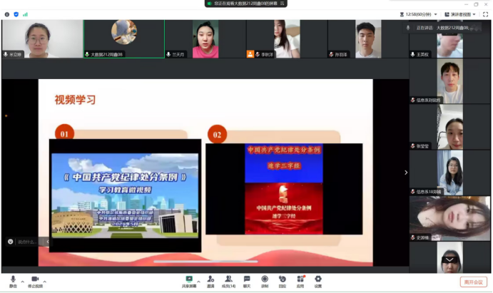 7月25日下午,为深入贯彻党的二十大精神,加强党员纪律教育,提高党员党性修养和纪律意识,计算机与电子专业学生党支部通过线上会议的形式开展了以“学纪守规,强基固本”为主题的党员大会,由党支部书记兰天月主持,共14人参会。