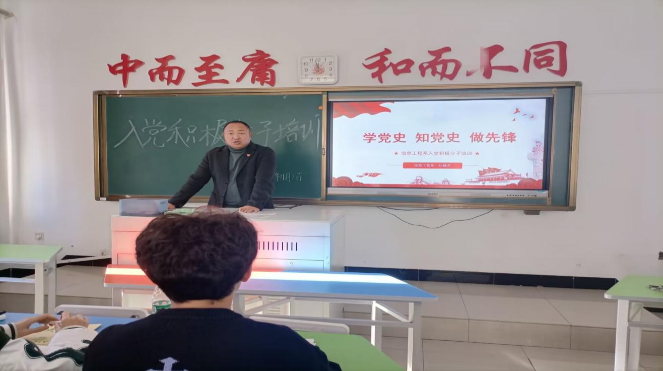 11月1日中午,为不断提高入党积极分子的思想政治素质和政治理论水平,进一步提高入党积极分子对党的认识,持续深入推进党史学习教育,明确入党目的,端正入党动机,信息工程系在1#1405开展2022年下半年入党积极分子培训开班式以“学党史知党史做先锋”为题的培训,培训由信息工程系党总支副书记孙晓芳主持,共24未入党申请人参加。