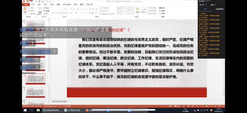 2020年4月13日,信息工程系党总支开展入党积极分子培训—入党誓词的历史沿革,此次培训课由佀冬梅老师担任讲师,共有117人参加此次培训。
