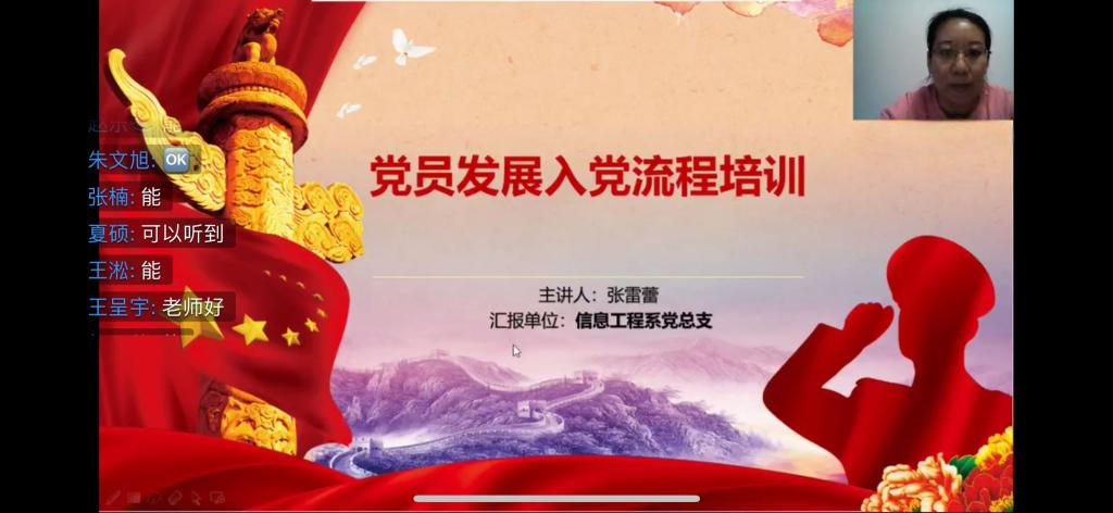 2020年4月9日,信息工程系党总支采用钉钉直播形式,开展了信息工程系党总支2020年度入党积极分子培训的第四课—发展党员流程,本次课程信息工程系计算机与电子专业学生党支部书记张雷蕾老师由主讲。