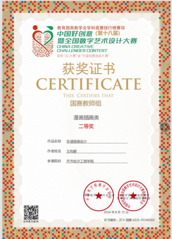 近日,备受瞩目的中国好创意暨全国数字艺术设计大赛国赛获奖名单正式揭晓,我校信息工程系艺术类教师团队传来喜讯,姜岩、佟鑫、王昀碧、吴兵四位老师的作品凭借其独特创意脱颖而出,成功斩获殊荣,这是我系在该项赛事中取得的又一重大突破。