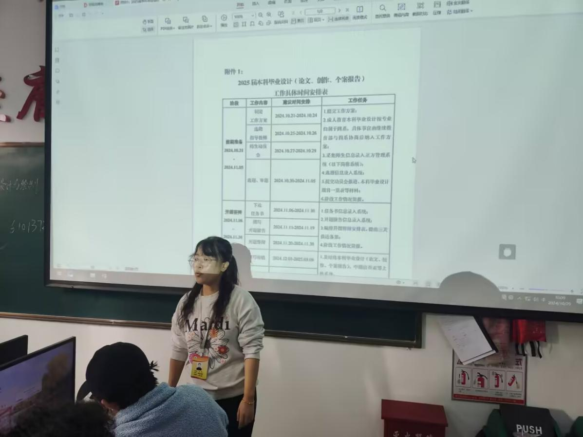 首先,关娜老师表示:“毕业将近,随之而来的是毕业设计。毕业设计是我们大学生活中最重要的一个环节,它不仅是对我们所学专业知识的综合运用和检验,更是我们展示自己能力和才华的重要平台。”通过毕业设计,我们可以将理论知识与实践相结合,提高自己的问题解决能力、创新能力和团队合作能力。同时,毕业设计也是我们走向社会、迈向职业生涯的重要一步,它将为我们的未来发展奠定坚实的基础。随后,关娜老师向同学们展示关于毕业设计的要求,选题,设计方向等。要高度重视,认真对待。毕业设计是我们大学四年学习的总结和升华,它的质量直接关系到我们能否顺利毕业以及未来的发展。要充分认识到毕业设计的重要性,以高度的责任感和认真负责的态度投入到毕业设计中去。最后,关娜老师强调学术不端问题,在论文完成过程坚决不能出现剽窃他人学术成果、抄袭等学术不端行为。