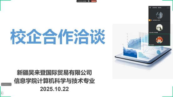 10月22日,为深化产教融合、促进校企协同育人,精准对接行业需求、提升人才培养质量,在李野院长的统筹部署与指导下,计算机科学与技术专业与新疆昊来登国际贸易有限公司通过腾讯会议形式,成功举办线上校企合作洽谈会。新疆昊来登国际贸易有限公司经理张凌风,计算机科学与技术专业负责人韩楠楠、专业教师杨学仁出席会议。
