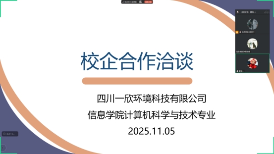11月5日,为深化产教融合、促进校企资源共享与优势互补,在李野院长的统筹部署与指导下,计算机科学与技术专业与四川一欣环境科技有限公司通过腾讯会议平台召开线上校企合作洽谈会。双方围绕人才联合培养、技术协同攻关、实训基地建设等核心议题展开深入交流。计科专业负责人韩楠楠及教师代表杨学仁、四川一欣环境科技有限公司总经理夏湘一出席会议。