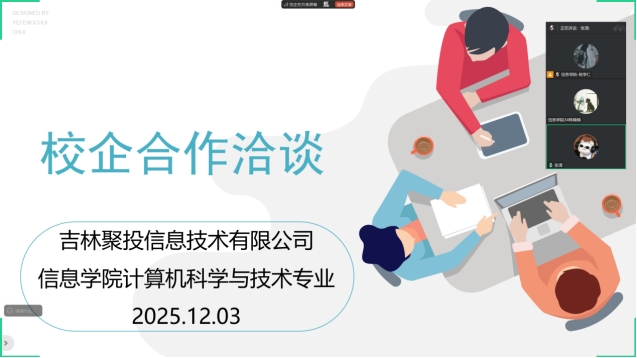 12月3日,为深化产教融合机制,推动教育链、人才链与产业链、创新链精准衔接,切实提升计算机科学与技术专业人才培养的针对性和实效性,在李野院长的统筹部署与指导下,计算机科学与技术专业与吉林聚投信息技术有限公司通过腾讯会议平台成功举办线上校企合作洽谈会。专业负责人韩楠楠、教师代表杨学仁,吉林聚投信息技术有限公司经理张清出席本次会议。