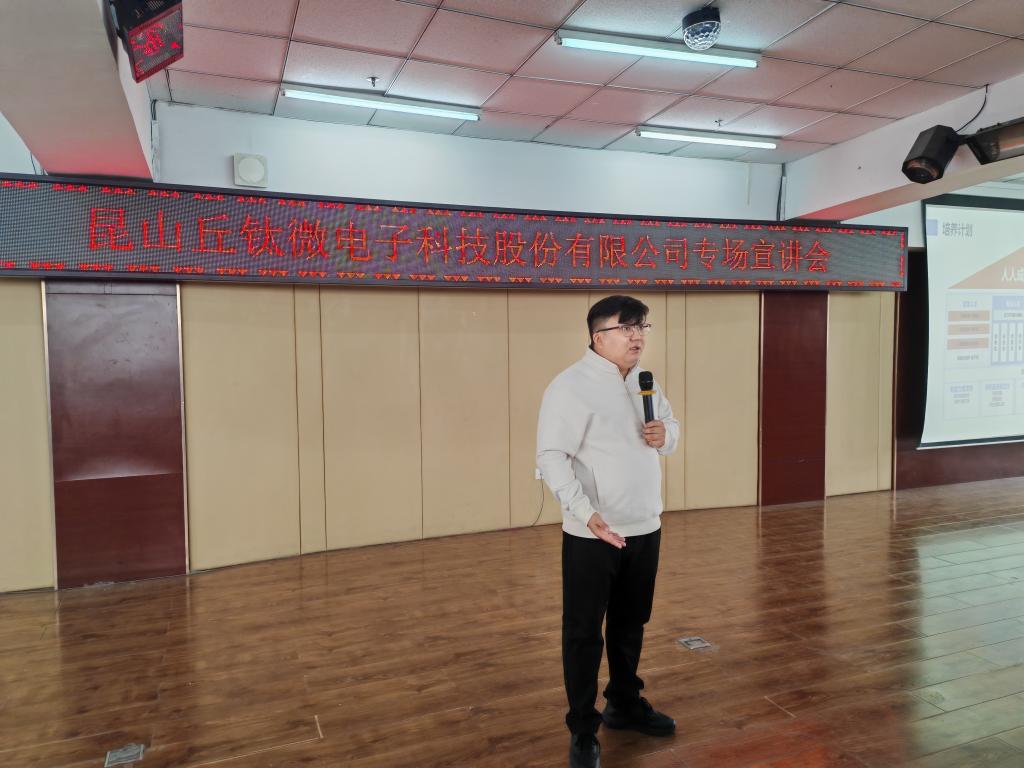 会上,王金超全面介绍了昆山丘钛微电子的发展历程、核心技术优势及人才战略。作为全球领先的智能视觉系统制造商,企业深耕高端摄像头模组、指纹识别模组及光电传感产品的研发、制造与销售,产品广泛应用于智能手机、智能汽车、物联网、无人机等多个前沿领域,服务于华为、小米、OPPO、vivo、小鹏、比亚迪等知名企业。凭借扎实的技术积累与产业影响力,企业在数字模组领域位居全球第三、生物模组领域位居全球第一。王金超重点解读了“电码双芯实验班”的培养方向与岗位设置,围绕技术研发、质量管控、生产管理、设备运维等核心岗位,进一步明确技能标准和职业成长路径,为学生提供清晰的发展规划与广阔的发展空间。