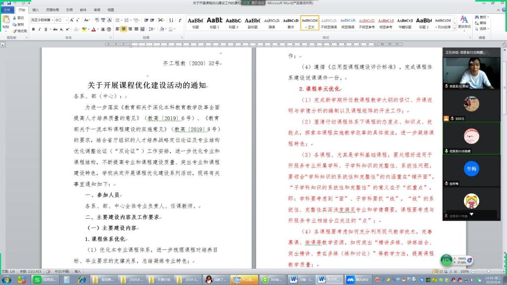 为响应学院进一步优化专业和课程结构,不断提高专业和课程建设质量、突出专业和课程建设特色。视觉传达设计专业于2020年8月4日下午两点三十分,为响应学院要求教师积极参与到各系各专业人才培养方案修订的工作中去,视觉传达设计专业于腾讯会议上召开了教师参与人才培养方案细节修订大会。参会人员有信息工程系教学副主任刘春媛、艺术专业全体任课教师以及部门公共课的任课教师。